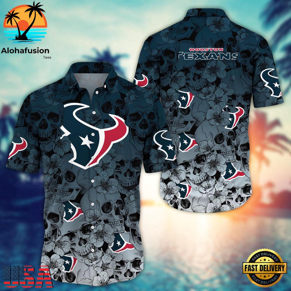 Introducing the latest trend in NFL fan apparel for 2023, the Houston Texans Skull Pattern Aloha Hawaiian Shirt. This one-of-a-kind shirt combines the spirited energy of the Houston Texans brand with a unique skull pattern design, perfect for those who want to stand out while cheering for their favorite team.